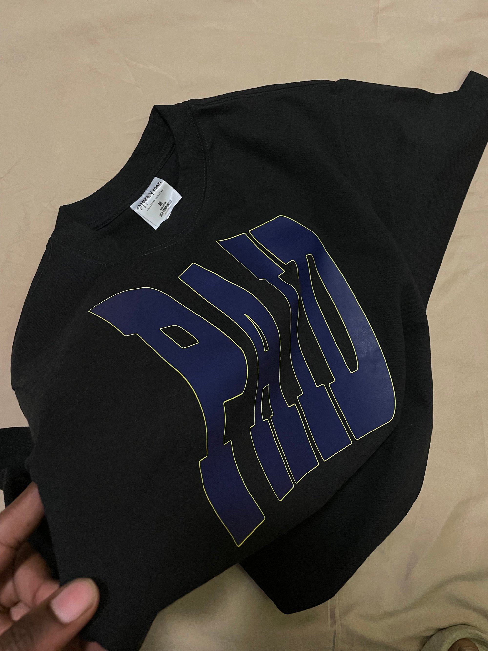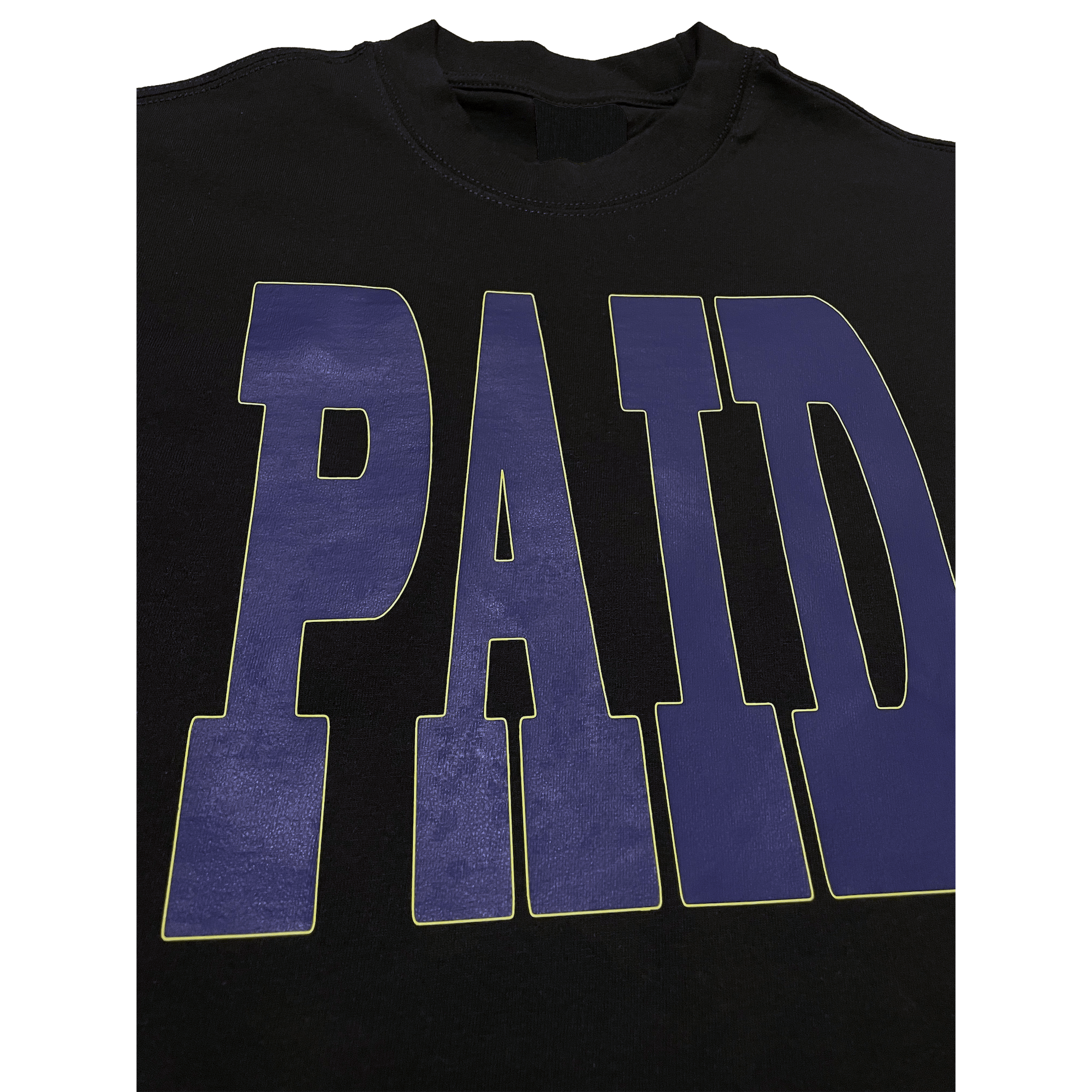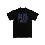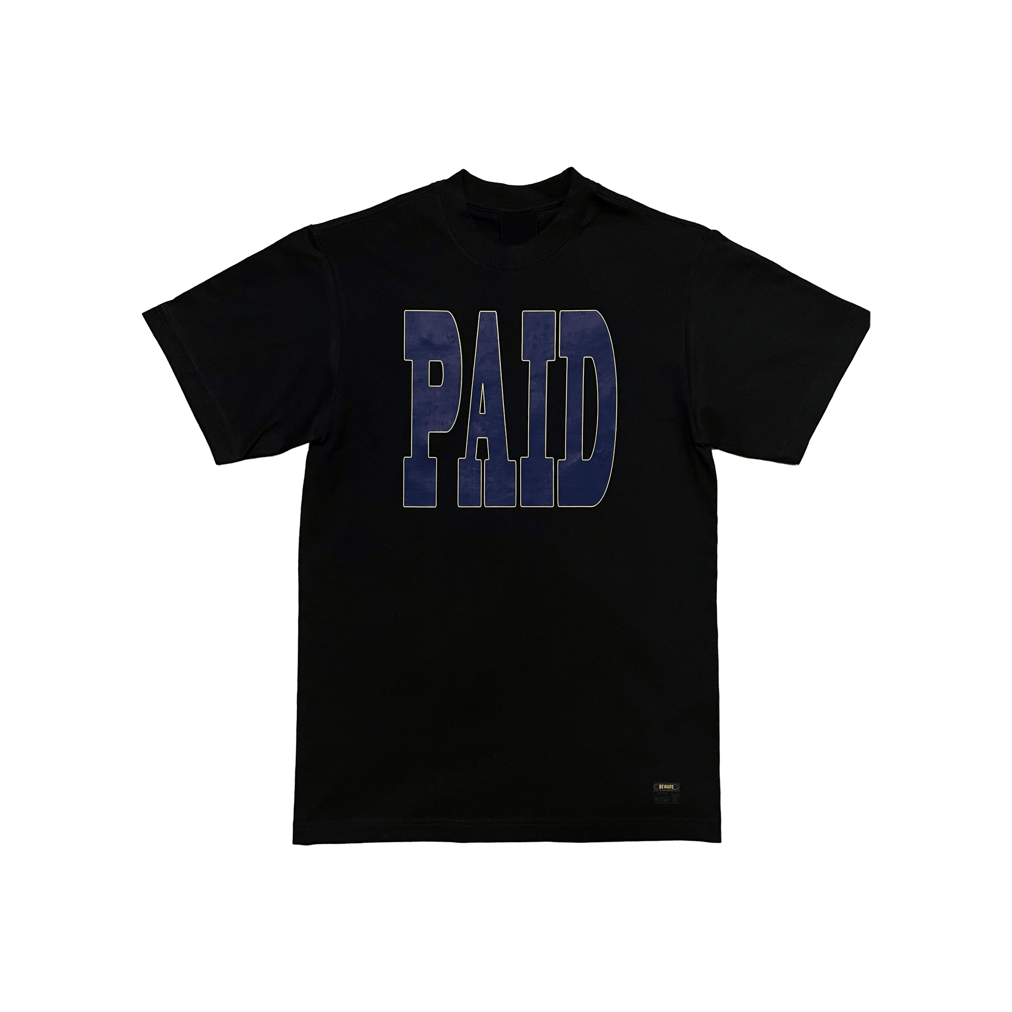 PAID college font in navy'ish blue with yellow outline on black tee.